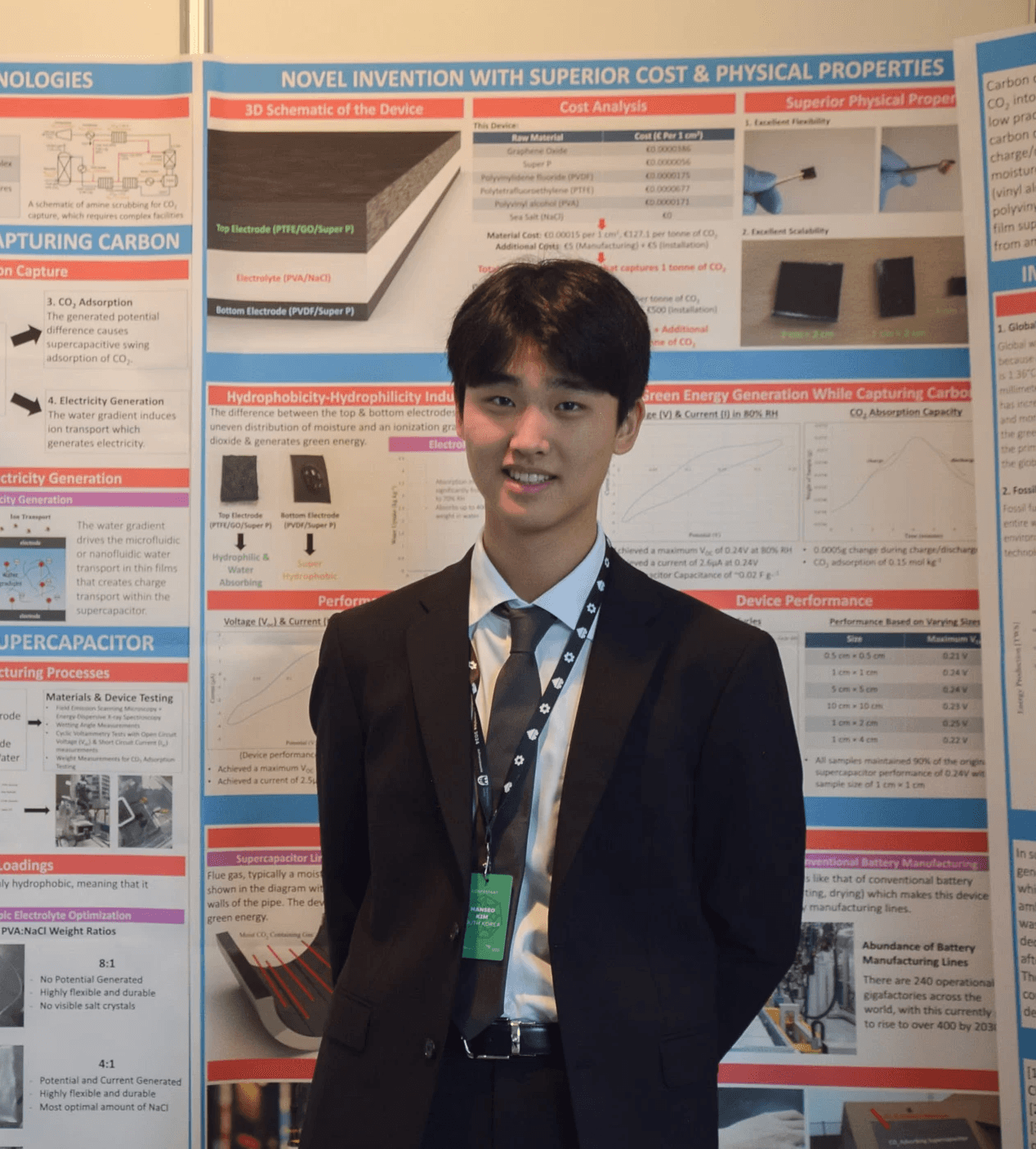 Hanseo’s work has earned him national and international acclaim, including the Talent Award of Korea, Korea Minister of Trade, Industry, and Energy Award, 1st Place in Engineering at the 2025 Taiwan International Science Fair, and recognition as one of South Korea’s top high school researchers at the 2023 Korea Science & Engineering Fair. His supercapacitor project was selected as one of only three to represent Korea at the 2024 European Union Contest for Young Scientists (EUCYS), where he received the ISTF Prize.